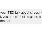 I just watched your TED talk about choosing not to have children. Thank you. I don’t feel so alone now in my choice to not become a mother.”