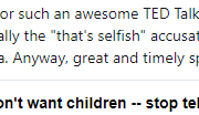 …Thank you for such an awesome TED Talk. So true for those of us who chose “no” — especially the “that’s selfish” accusation. The 1-in-5 statistic shocked me; I had no idea. Anyway, great and timely speech.”